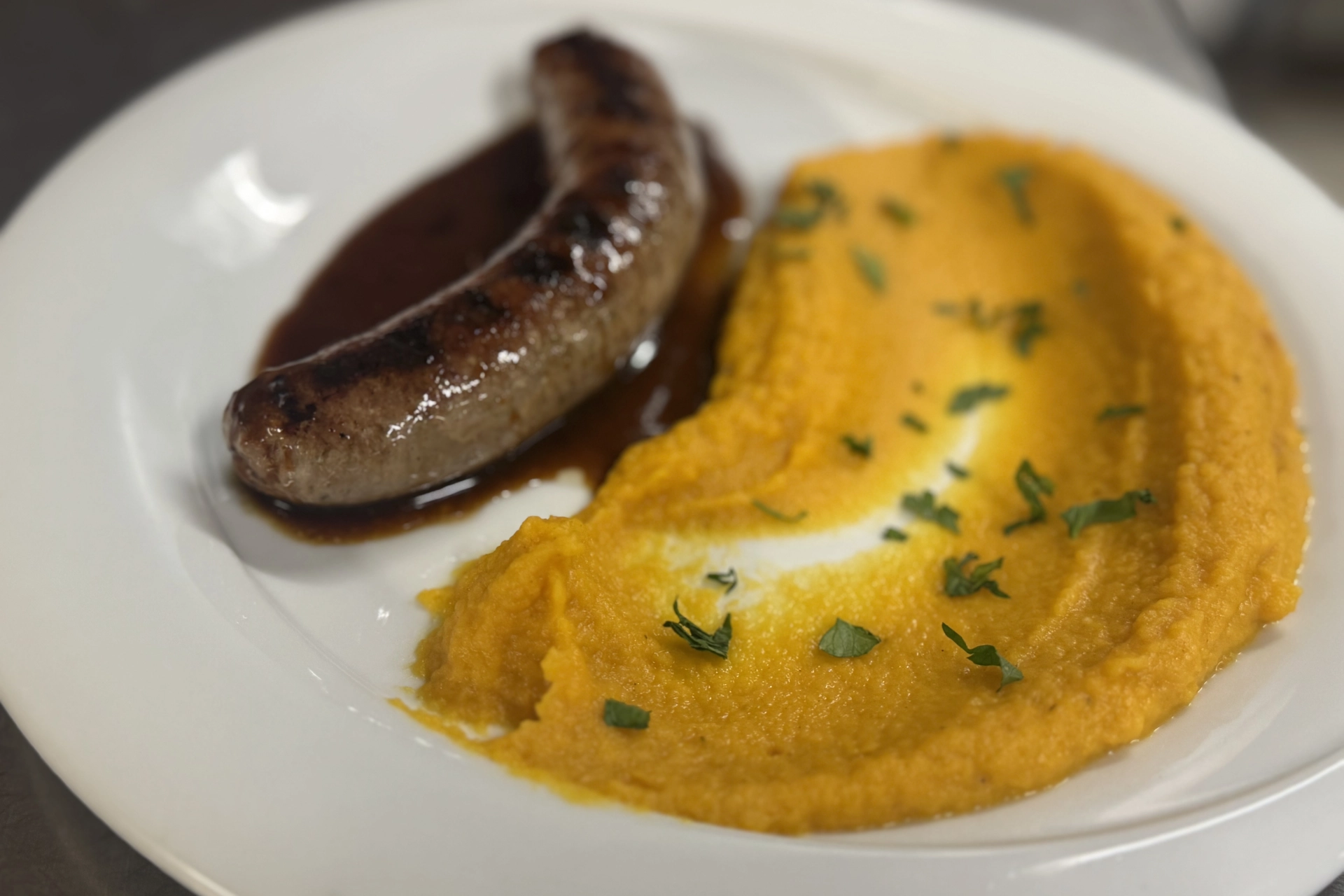Filet de daurade à la plancha, gremolata, purée de patate douce et légumes du moment rôtis